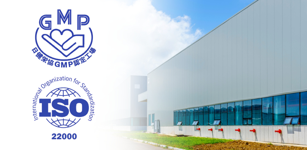 さらに、製造はGMP認定工場ならびにISO22000認証取得した工場にて行っております。国際基準に準拠した管理体制のもと、原材料の受け入れから製造・検査・出荷に至るまで、徹底した品質・安全性の確保を行っています。